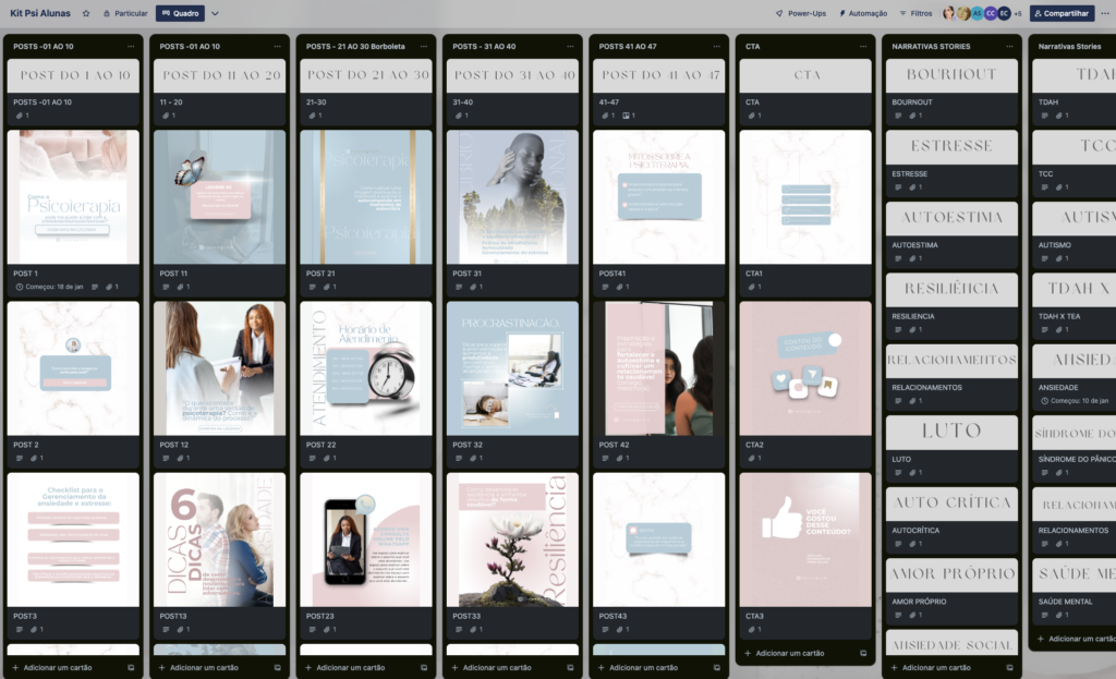 Quadro no trello com posts, legendas e narrativas organizadas por assunto.